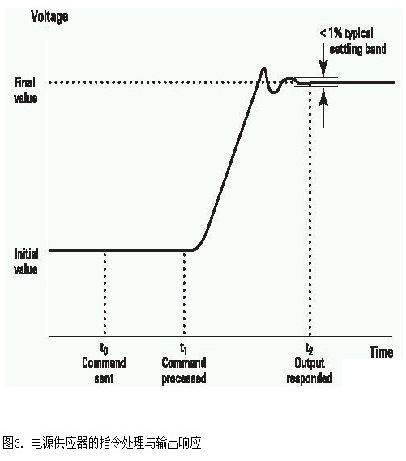 將電源供應器的輸出電壓設定變更為新值時,必須經歷幾個步驟,如圖3 所示。這些步驟所花的時間很有限。當電源供應器接收到指令時,必須加以處理,因此會有一段指令處理時間。接著,電源供應器的輸出會予以回應并變更成新的設定。它在某個穩定區段內達到終值所花的時間,即為輸出響應時間。1%的穩定區段對ECU 測試來說是合適的。特別需要注意的是下調設定時的輸出響應時間。許多電源供應器都必須依賴真實的DUT 負載來降低電壓,在負載較小的情況下,一些不具下調設定器的電源供應器可能需要花一秒左右的時間來達到終值。N6752A 電源供應器模組內建了一個下調設定器,能夠加快下調設定的速度,而不受負載的影響。在ECU 測試中,上調與下調設定都必須夠快才行。