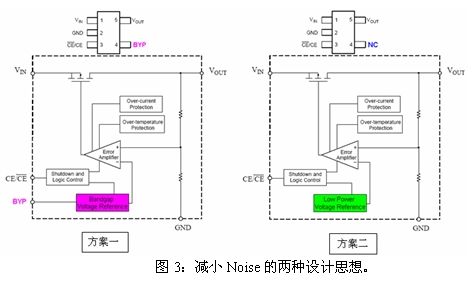 方案一中,如不加bypass電容,CMOS LDO的噪聲一般在200~450uVrms(沒(méi)有負(fù)載時(shí)的電源電流越小,這個(gè)噪聲越大),加了這個(gè)電容濾波后,LDO的噪聲一般為30~50 uVrms,因此方案一的低噪聲CMOS LDO都是有這個(gè)Bypass腳,并且是必須加這個(gè)濾波電容才能做到低噪聲。
