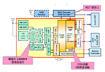圖4是安森美半導體DSP調諧器的框圖。從圖中可以看出,模擬前端是新設計的新設計LNA和MIX,可低電壓運行,只需5 V供電;數字后端可以支持廣播接口。DSP采用CMA算法,具有HD混音功能。