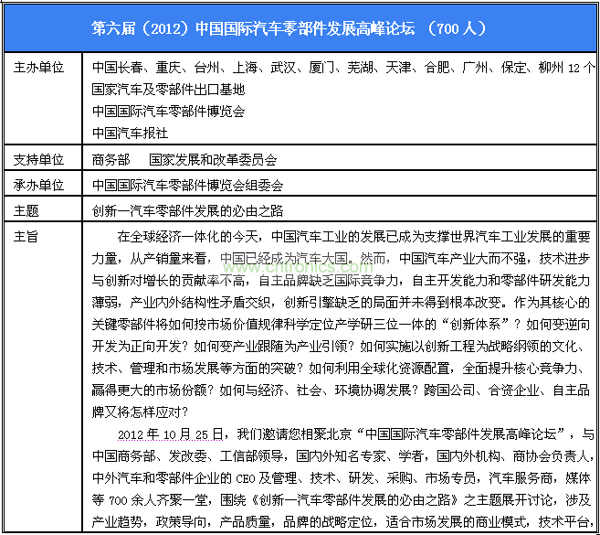 第六屆中國國際汽車零部件發展高峰論壇,將以“創新—汽車零部件發展的必由之路”為主題,誠邀業界廣泛參與,激情碰撞,智慧共享。