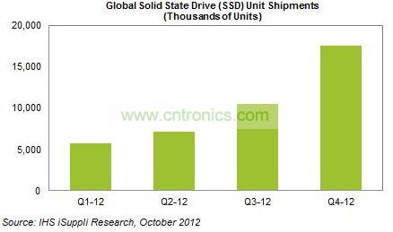 據IHS iSuppli提供的數據,SSD上半年全球出貨量共計1290萬塊,而第三季度單季就達到了1050萬塊,并在第四季度提升到1750萬塊。也就是說,下半年的出貨量將達到上半年的兩倍以上。