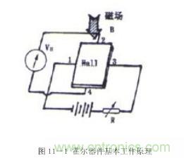 霍爾元件是根據霍爾效應進行磁電轉換的磁敏元件,其典型的工作原理圖如圖所示。霍爾元件是一個N型半導體薄片,若在其相對兩側通以控制電流I,而在薄片垂直方向加以磁場氏 則在半導體另外兩側便會產生一個大小與電流,和磁場B的乘積成工比的電壓。這個現象就是霍爾效應,所產生的電壓叫霍爾電壓UR.