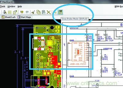 6.0版本中的交叉探測(X-probe)功能能夠在軟件內實現原理圖與PCB設計視圖之間的即時引用,從而進一步加快設計過程。通常情況下在PCB視圖中元件的識別是比較直觀、容易的,但在原理圖中找到該元件的對應符號卻不那么容易,除非用戶對整個系統都了如指掌。通過交叉探測功能,用戶只需在任一視圖中點擊某個元件,即可迅速跳轉到對應視圖中的同一元件。該功能可從PCB視圖跳轉到原理圖,反之亦然。