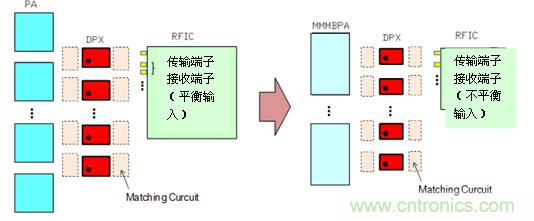 移動(dòng)終端的前端部分搭載的電子元器件隨著通信功能的混載和搭載頻帶數(shù)量的增加,正在日漸小型化。在構(gòu)成無線通信設(shè)備的同時(shí),RF收發(fā)器IC(RFIC;射頻集成電路)是必備的元器件。RFIC具有變化電波頻率、調(diào)節(jié)和調(diào)整信號(hào)功能。RFIC的接收端輸入端子的趨勢(shì)是由平衡輸入轉(zhuǎn)化成不平衡輸入,通過實(shí)現(xiàn)不平衡輸入的信號(hào)處理來達(dá)到削減RFIC端子數(shù)量的小型化目的。另外,PA的信號(hào)強(qiáng)度增加,采用了MMMB(多模多頻段)PA。如果只用對(duì)應(yīng)一個(gè)頻帶的PA構(gòu)成的話,那只搭載頻帶數(shù)的PA就變得非常必要了,MMMBPA對(duì)應(yīng)的是多波段,一個(gè)元器件就能覆蓋多個(gè)的頻帶。如果使用這個(gè)的話,可以通過減少元器件個(gè)數(shù)來實(shí)現(xiàn)縮小搭載面積的目的。電感器、電容這種匹配的元件也不例外,可以推進(jìn)從0603尺寸(0.6×0.3mm)到0402尺寸(0.4×0.2mm)的小型化。