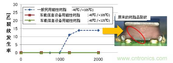 熱沖擊投入周期數和裂紋發生率的關系如圖3所示。一般民用市場的磁性樹脂在1000輪以下就會產生裂紋,而我們開發的車載信息設備用磁性樹脂在2000輪之后仍然沒有產生裂紋。并且確保即使在更嚴厲的-40℃⇔+125℃環境下的熱沖擊試驗中也不會產生裂紋。