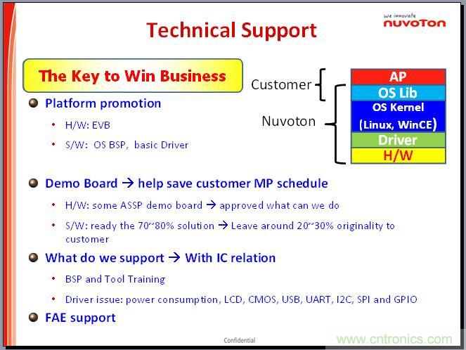 這個(gè)是我們目前的所謂的開(kāi)發(fā)的門(mén)檻,其實(shí)以新唐的MCP來(lái)講,我們做的比較簡(jiǎn)單,我們的整個(gè)系列都有提供,新唐側(cè)重于在驅(qū)動(dòng)方面。另外我們公司在深圳科技園也有定期的培訓(xùn)課程。在深圳的本地,我們也有技術(shù)支持。