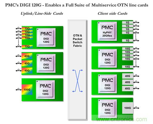 PMC的DIGI 120G是一款功能強大的100G OTN處理器,設計初衷是實現下一代光傳送網絡。DIGI 120G提供了高度靈活的平臺,使得OEM可以設計范圍廣泛的OTN解決方案,其中包括用于OTN交換的高密度線卡以及功能強大的用于P-OTN的混合OTN/分組線卡。DIGI 120G的獨特性在于: