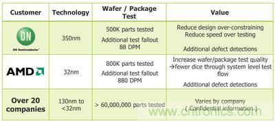 事實(shí)證明,單元識(shí)別 ATPG 測(cè)試法是唯一可以發(fā)現(xiàn)傳統(tǒng)方法檢測(cè)不出的缺陷的方法。它可以發(fā)現(xiàn)一套完整的針對(duì)固定故障、節(jié)點(diǎn)跳變和時(shí)延缺陷的測(cè)試方法發(fā)現(xiàn)不了的缺陷,因?yàn)檫@種方法首先就對(duì)標(biāo)準(zhǔn)單元進(jìn)行物理布局時(shí)可能出現(xiàn)的實(shí)際缺陷進(jìn)行模擬。在新技術(shù)的改進(jìn)下,單元識(shí)別測(cè)試法中的測(cè)試向量大小得以縮小,但整個(gè)測(cè)試向量仍大于傳統(tǒng)的測(cè)試方法產(chǎn)生的測(cè)試向量,因此要進(jìn)行嵌入式壓縮。許多公司因?yàn)椴捎脝卧R(shí)別測(cè)試法而收效顯著。部分成效的概述請(qǐng)見圖1。
