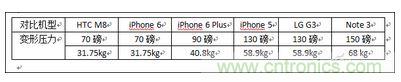 此外,美國(guó)《消費(fèi)者報(bào)告》利用三點(diǎn)式測(cè)試方案,將iPhone 5、iPhone 6、iPhone 6 Plus、HTC M8、LG G3以及三星Note 3手機(jī)懸空固定,并對(duì)機(jī)身中間部位施加壓力,計(jì)算上述手機(jī)變彎時(shí)所能承受的壓力上限。結(jié)果顯示(見(jiàn)表),iPhone 6/Plus和HTC M8的承受壓力最低(圖4),在受力達(dá)31kg左右時(shí)就會(huì)被壓彎,而表現(xiàn)最好的是Note 3,在68kg壓力時(shí)“防線”才會(huì)崩潰。