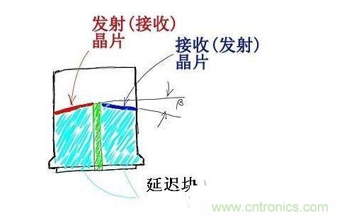 雙晶直探頭的兩個縱波晶片一個用于發射超聲,一個用于接收超聲(圖一)。發射壓電晶片大都采用發射性能好的鋯鈦酸鉛,接收壓電晶片大都采用接收性能好的硫酸 鋰。區別于單晶探頭而言,雙晶探頭的發射靈敏度和接收靈敏度都更高。雙晶探頭的兩個晶片之間有一片吸聲性強、絕緣性好的隔聲層,它不僅用于克服發射聲束與 反射聲束的相互干擾和阻塞,而且能使脈沖變窄、分辨率提高、消除發射晶片和延遲塊之間的反射雜波進入接收晶片,有效減少雜波。