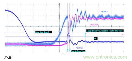 測(cè)試的目的是看上MOS管導(dǎo)通時(shí),有沒有同時(shí)把下管打開,從而導(dǎo)致電源直接導(dǎo)通到地而引起短路。如圖三所示藍(lán)色曲線(Vgs_Lmos)就是下管在上管導(dǎo)通的同時(shí),被帶了起來,如果藍(lán)色曲線的被帶起來的尖峰超過了MOS管的Vth要求,同時(shí)持續(xù)時(shí)間(Duration)也超過了datasheet要求,從而就會(huì)有同時(shí)導(dǎo)通的風(fēng)險(xiǎn)。當(dāng)然,這是大家最常見到的情況。