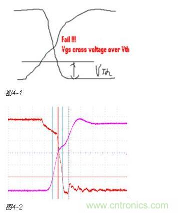 下面這種情況有非常多的人會(huì)忽視,甚至是一些比較有經(jīng)驗(yàn)的電源測(cè)試工程師。下面組圖四是下管打開,上管關(guān)閉時(shí)候的波形(圖4-1是示意圖,圖4-2示實(shí)際測(cè)試圖)。雖然沒有被同時(shí)帶起的情況,但是請(qǐng)注意上下管有交叉的現(xiàn)象,而且交叉點(diǎn)的電平遠(yuǎn)高于MOS管規(guī)定的Vth值,這是個(gè)嚴(yán)重的shoot through現(xiàn)象。最直接的后果就是MOS管燒毀!