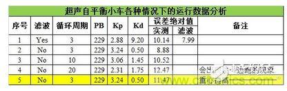 誤差絕對值是指小車在一段時間內,實測距離與設定平衡點距離誤差絕對值的平均值;濾波是指程序中對超聲波測量的距離濾波或不濾波直接使用;循環(huán)周期是程序中的延時時間,超聲波測量需要大約704us,一個周期大約為3.84ms,程序處理時間大約為136us.