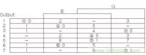 圖2:異步有限狀態機(FSM)轉換主表,其中1,2,3,4,5,6,7帶圈的數字是穩定FSM狀態號(G是時鐘輸入)。