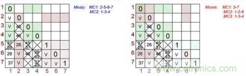 圖3:根據Mealy(左)和Moore(右)狀態機做出的最終表格對。