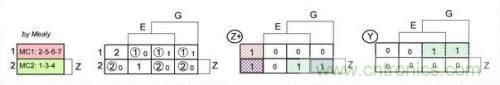 現在就很容易畫出壓縮的狀態轉換表,并為Z編碼的內存單元和輸出選通信號Y畫出卡諾-維奇圖(圖4)。
