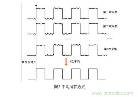 第三個(gè)就是平均捕獲模式了,這個(gè)名字也非常容易理解,就是采集N屏信號(hào),將它們?cè)谟|發(fā)位置對(duì)其,然后做平均運(yùn)算。
