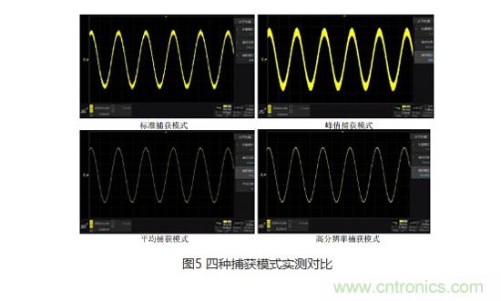 在了解完四種捕獲模式的工作原理之后,我們來做一個(gè)對(duì)比,在輸入一個(gè)相同的信號(hào)時(shí),標(biāo)準(zhǔn)捕獲模式下可以觀察到信號(hào)中存在噪聲,峰值捕獲模式下信號(hào)的噪聲較為明顯,而在平均捕獲模式及高分辨率捕獲模式下,幾乎沒有看到隨機(jī)噪聲。