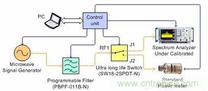 在圖1中,微波信號發(fā)生器所產生的信號經過一個可編程的帶通濾波器到達一個SPDT微波開關的輸入端(RF1),開關的二個輸出端J1和J2分別接需要被校準的頻譜分析儀和標準功率計。在校準測試過程中,功率計讀一次來自信號源的幅度后,開關即刻切換到頻譜分析儀,并記錄頻譜分析儀針對信號源幅度的讀數。