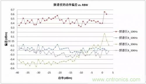 頻譜分析儀B在RBW=10kHz和30kHz條件下,的幅度測試誤差約為-0.1dB至-0.35dB之間。