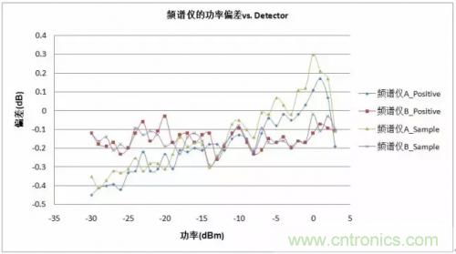 從測試結果我們發(fā)現,在Positive和Sample這二種Detector條件下,對于連續(xù)波信號的測試,二臺頻譜分析儀的幅度誤差變化甚微,而對于調制信號,還需要類似的測試來進一步驗證。