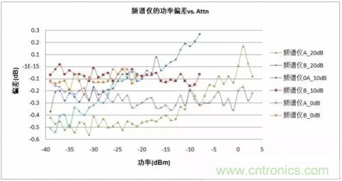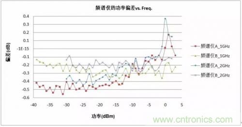 在測試過程中,每個參數的變化均以功率計為參照值,頻譜分析儀與功率計讀數的差值即為頻譜分析儀的精度偏差。