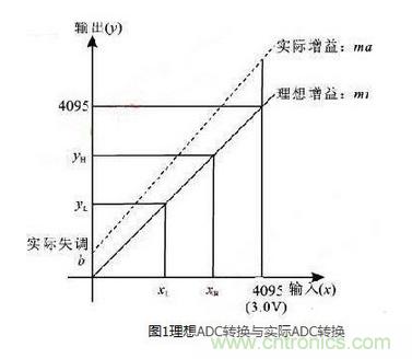 對于雙極性輸入,其0 V輸入的增益誤差對應單極性輸入的1.4315V的增益誤差,因此,原有ADC的增益誤差和失調誤差被增大了。例如,如果ADC的增益誤差為5%,失調誤差為2%,則其雙極性的增益誤差計算如下:雙極性輸入x′= 0.0000 V,單極性的ADC輸入電壓x = 1.4315 V,其理想的轉換值為ye=1.4315×4095/3=1954,而由ya=1954×1.05+80計算得實際轉換值,則雙極性增益誤差為ya-ye=2132-1954=178(9.1%誤差)。通過計算可以看出,ADC的誤差大大增加,因此要使用ADC進行數據采集,就必須對ADC進行校正,提高其轉換精度。