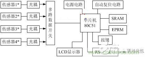 壓力測(cè)量控制系統(tǒng)的結(jié)構(gòu)如圖1所示, 它以80C51單片機(jī)為核心, 包括傳感器、光耦、多路數(shù)據(jù)開(kāi)關(guān)、LCD液晶顯示器、SRAM, EPROM、自動(dòng)復(fù)位電路、RS-485接口電路及高效電源電路等。下面分別介紹一下它們各自的設(shè)計(jì)特點(diǎn)。