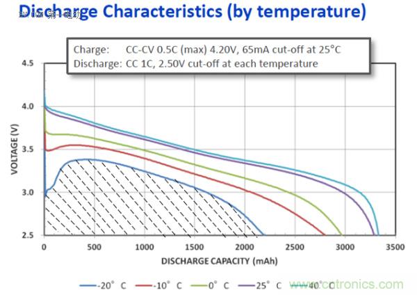 容量測試Output:溫度與容量(能量)關系表。以時間T為X軸,以電壓V為Y軸。不同溫度下1C放電截止在X軸上的點為容量與溫度的關系。而各個放電曲線與X、Y軸形成的面積之比就是不同溫度下的可用能量之比。如下圖所示:-20℃時的電池可用能量(Wh) = 陰影部分的面積S。由此可見,SOE比SOC能更加準確的表示出剩余的能量,從而更準確的評估剩余里程。
