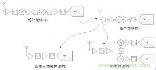 十年前,大多數無線電設備建立在較為基礎的超外差結構上,且具有多個下變頻級。當時,我們見證了高 IF (中頻) 結構中出現單個下變頻級的變化。這得益于ADC帶寬、采樣速率與性能等的顯著改善,這些顯著的改善使第二或第三奈奎斯特區域的信號采樣得以實現。ADS62P45 ADC便是引領這次變化的一個典型代表。現在,ADC技術進一步得到改進與提升,使得無線電中最后一個下變頻級也得以消除,從而支持直接射頻(RF)采樣接收機。參見圖1。