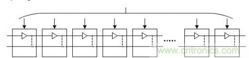 圖 1給出一個(gè)預(yù)定數(shù)量的延遲單元構(gòu)成的延遲線電路和通過配置字實(shí)現(xiàn)的反饋通道(Dfb)的示例,通過延遲配置字,可以在Din引腳輸入信號和Dout引腳輸出信號之間設(shè)定所需 延時(shí)。每個(gè)延遲單元在Din和Dl兩個(gè)引腳之間生成固定的通道延時(shí)。