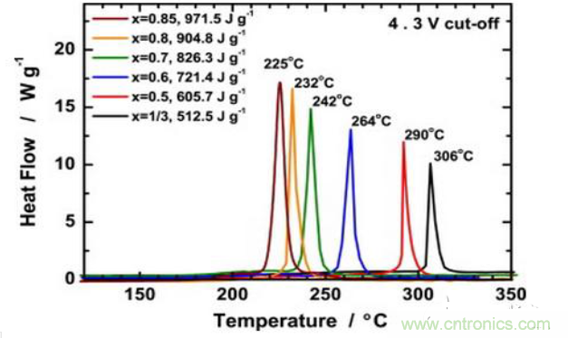 而且隨著NCM能量密度的不斷提高,材料的熱穩(wěn)定性會(huì)越來(lái)越差。下圖表述的是隨著Ni含量的升高材料的分解溫度逐漸下降。