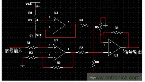 開關(guān)CD4051來連接不同的電阻,不同的R1,R2通過公式:這樣就可以實現(xiàn)程控放大功能了。可調(diào)電阻R9用來設(shè)置信號調(diào)理電路加入的直流分量的大小。放大后的信號和直流分量最后由U3模擬加法器疊加后輸出。