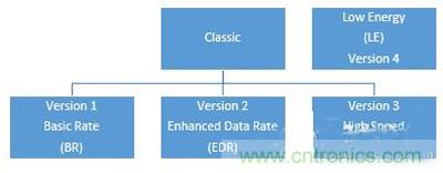 通過把模塊進一步劃分成不同版本,藍牙SIG簡化了這一前期決策。藍牙技術版本分為經典版本和低能耗(LE)版本。經濟藍牙版本1、2和3是為數據傳輸速率優化的。在經典版本中,它分成基本速率(BR)、增強數據速率(EDR)和高速。低能耗藍牙則把更多的重點放在簡單的信息傳輸上,同時盡可能延長電子器件的續航時間。