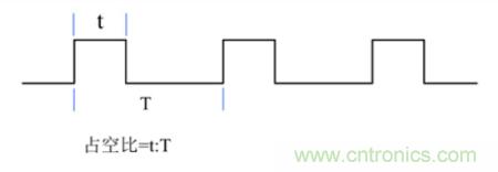 脈沖寬度調制(PWM)是一種對模擬信號進行數字編碼的方法。通過高分辨率計數器的使用,方波的占空比被調制用來對一個具體模擬信號進行編碼。PWM信號仍然是數字的,因為在給定的任何時刻,滿幅值的直流供電要么完全有(ON),要么完全無(OFF)。電壓或電流是以一種通(ON)或斷(OFF)的重復脈沖序列被加到模擬負載上去。通的時候即是直流供電被加到負載上的時候,斷的時候即是供電被斷開的時候。只要帶寬足夠,任何模擬值都可以使用PWM進行編碼。而占空比就是高電平持續時間與整個周期時間的比值,占空比越大,高電平持續的時間越長,模擬電路開通的時間就越長,如圖1所示。
