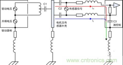 這一款驅動器比較特殊,變頻器不輸出時內部開關管依然處于工作狀態,相比其它變頻器這款干擾很大。分析其噪聲模型如下圖所示,驅動器輸出共模電壓,繞組與機殼間存在寄生電容C1,機殼與傳感器電路有寄生電容C2,形成傳導路徑,電機和傳感器殼體作為中間導體雖然接地,不過驅動器、電機、測控柜距離較遠,接地線阻抗高中間導體電位并不為零,仍有高頻共模電流通過電纜進入PA。PA扭矩輸入是BNC型端子,內部電路地對機殼多少有一些空間雜散電容C3(約幾十pF),共模電壓在兩信號線產生不對稱的電流,從而在線路阻抗上轉化為差模電壓疊加在正常信號中。