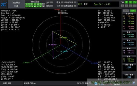 此時將系統運行起來,通過功率分析儀的數據和波形再次進行驗證,電壓波形圖和矢量圖都很完美。
