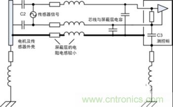 4)此處電機平臺和測控柜已有接地,通過傳感器連接線屏蔽層又將兩者連接,形成地環路。然而實際工程應用中地環路往往不可避免地存在,本例中若沒有屏蔽層依然會通過C2、電纜和C3產生高頻地環路,從這方面看屏蔽層改變了環路路徑。