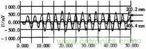 由于頻率的提高,傳輸線之間的串擾明顯增大,對信號完整性也有很大的影響,可以通過仿真來預測、模擬,并采取措施加以改善。以CMOS信號為例建立仿真模型,如圖6所示。在仿真時設置干擾信號的頻率為66MHz的方波,被干擾者設置為零電平輸入,通過調整兩根線的間距和兩線之間平行走線的長度來觀察被干擾者接收端的波形。仿真結果如圖7,分別為間距是203.2mm、406。4mm時的波形。