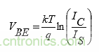 溫度感應設計通過巧妙的配置和計算來消除晶體管飽和電流(IS)的影響。使用恒流源(IC)以及晶體管和等同晶體管陣列之間的開關很容易控制飽和電流。在圖1中,我們看到VBE 和VBE(N)之間的差是如何輕松對應溫度變化的。 公式(1)顯示了晶體管基極-發射極電壓VBE的值。
