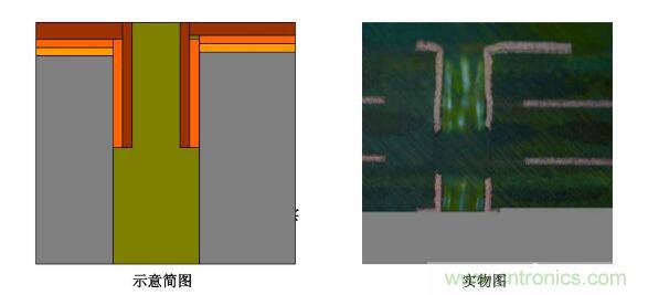 5.圖電孔無銅:斷口處圖電層未將板電層包住―――圖電層與板電層厚度均勻,斷口處齊斷;圖電層呈拉尖趨勢直至消失,板電層超過圖電層繼續(xù)延伸一段距離再行斷開。