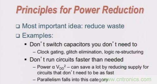 •降低電壓:電壓受頻率影響,可以通過降低頻率來降低所需電壓。當(dāng)頻率降低,電路開關(guān)速度降低,就能有更多時間去進(jìn)行充電,因此所需充電電壓就能降低(電壓越大充電速度越快)。同時,可通過流水線分割組合邏輯。若同時保持頻率不變,電路能有更多時間去進(jìn)行充電,從而降低所需充電電壓。