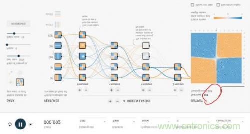 整個網(wǎng)絡(luò)的輸入層是FEATURES(待解決問題的特征),例如x1和x2表示垂直或者水平切分來劃分藍色與黃色點,這是最容易理解的2種劃分點的方法。其余5種其實不太容易想到,這也是傳統(tǒng)的專家系統(tǒng)才需要的,實際上,這個游樂場就是為了演示,1、好的神經(jīng)網(wǎng)絡(luò)只用最基本的x1,x2這樣的輸入層FEATURES就可以完美的實現(xiàn);2、即使有很多種輸入特征,我們其實并不清楚誰的權(quán)重最高,但好的神經(jīng)網(wǎng)絡(luò)會解決掉這個問題。