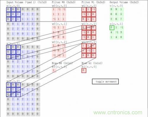 這里卷積核大小與移動的步長stride、輸出深度決定了下一層網(wǎng)絡(luò)的大小。同時,核大小與stride步長在導(dǎo)致上一層矩陣不夠大時,需要用padding來補0(如上圖灰色的0)。以上就叫做卷積運算,這樣的一層神經(jīng)元稱為卷積層。上圖中W0和W1表示深度為2。