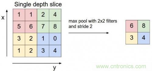 CNN中還有一個池化層,當(dāng)某一層輸出的數(shù)據(jù)量過大時,通過池化層可以對數(shù)據(jù)降維,在保持住特征的情況下減少數(shù)據(jù)量,例如下面的4*4矩陣通過取最大值降維到2*2矩陣: