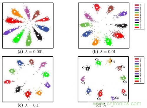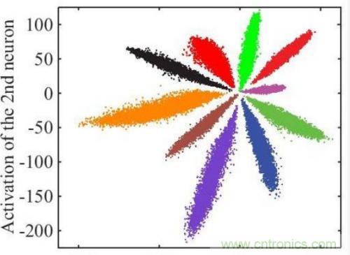 以上只是通用的CNN網(wǎng)絡(luò),由于人臉識別應(yīng)用中不是直接分類,而是有一個注冊階段,需要把照片的特征值取出來。如果直接拿softmax分類前的數(shù)據(jù)作為特征值效果很不好,例如下圖是直接將全連接層的輸出轉(zhuǎn)化為二維向量,在二維平面上通過顏色表示分類的可視化表示: