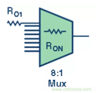 第二級,將放大器的輸出信號施加到多路復用器的 8 個輸入端 (圖3)。每個輸入以一個阻尼電阻 (RO) 進行緩沖,以減少多路復用器通道切換導致的電荷反沖。根據多路復用器數據手冊規定的技術規格,每個通道的內部會設有一些寄生電容或額定 RO。