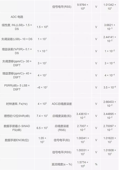 在計算結果,所有誤差均已轉換成電壓格式。這樣是為了方便起見,因為轉換器處于信號鏈末端,其輸入滿量程是以電壓進行描述的。RTO (參考輸出)用于描述從一級到下一級連續累計的 誤差。各級同時還產生一個獨立的合計數和RSS (和方根)合計數,以展示根據所用方法的不同,誤差是如何累積起來的。