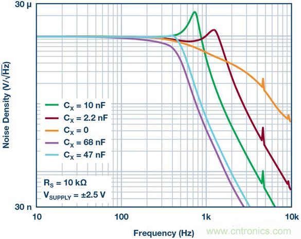 關鍵IC參數與運算放大器電源電流有關,低電源電流的器件可能需要稍大的CX,而高電源電流的器件很可能需要小于30 nF的電容,同時實現更寬的平坦帶寬。