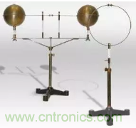 赫茲將兩個大的銅球作為電容,并通過銅棒連接在相隔很近的兩個小銅球上。兩個小銅球連出兩根導(dǎo)線,接到一個感應(yīng)線圈和一個電源之上。
